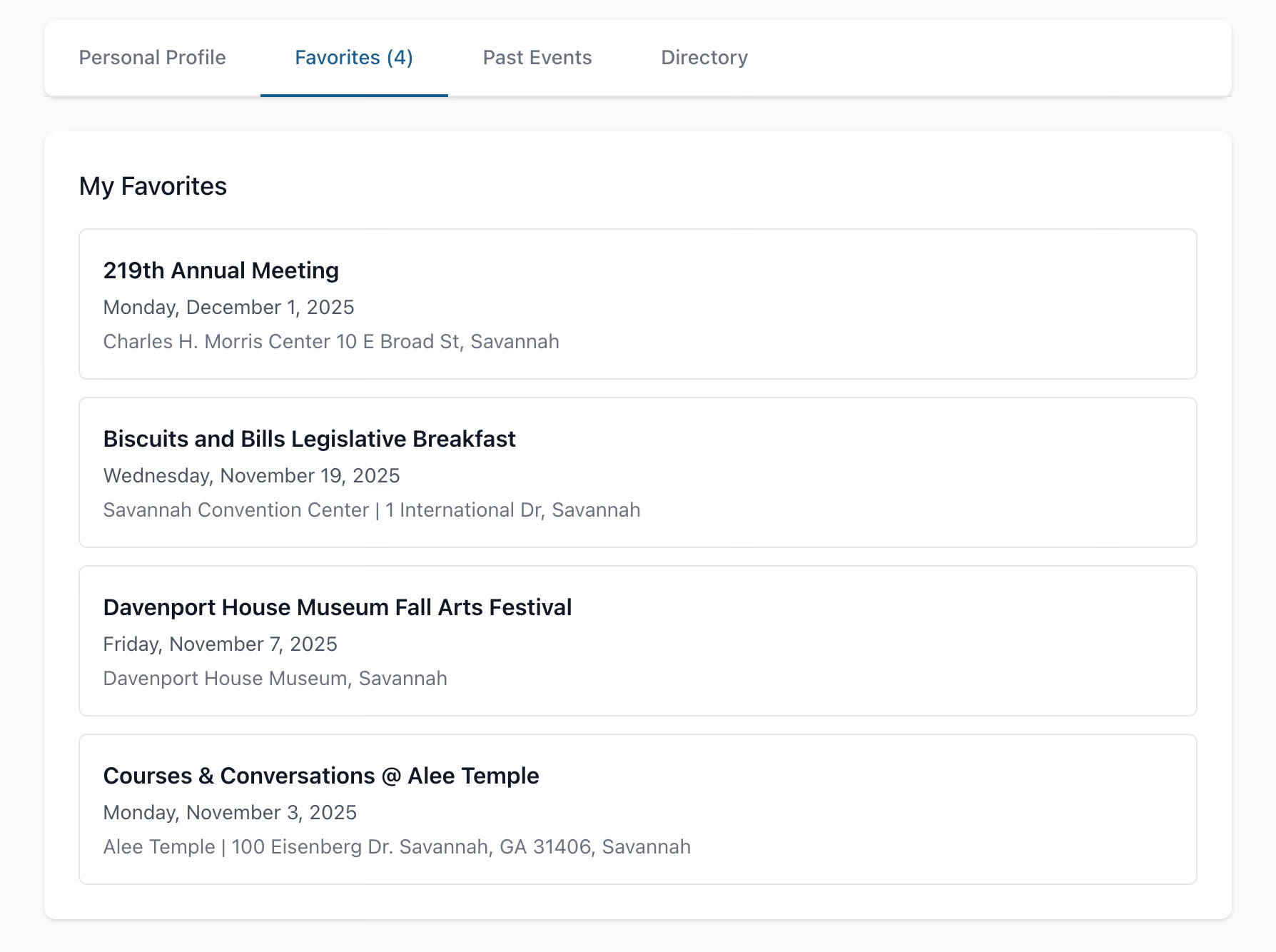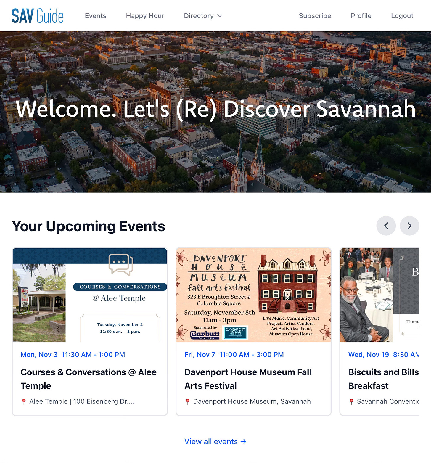 Starting today, when you are logged into SAV Guide and have a few favorite events, they will now appear on the home page of the guide. As the events end, the list will shift, showing you the most upcoming event, first.