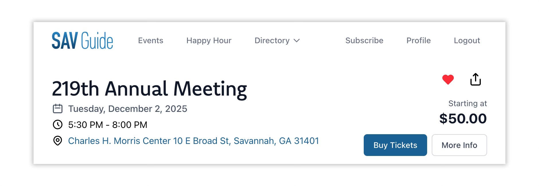 If you already have an account on SAV Guide, the favorites heart is all setup to go. If you’re new, simply register and start favoriting (I gotta think of a better word, but alas) events you’d like saved to your profile.